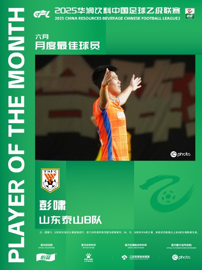【相关】泰山B队球员彭啸包揽中乙联赛6月最佳球员/最佳青年球员